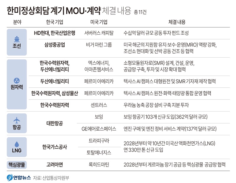 ¿ì¸®³ª¶ó¿Í ¹Ì±¹ÀÌ ÇÑ¹Ì Á¦Á¶¾÷ ¸£³×»ó½º ÆÄÆ®³Ê½ÊÀÇ ±³µÎº¸¸¦ ¸¶·ÃÇϱâ À§ÇØ Á¶¼±, ¿øÀÚ·Â, Ç×°ø, LNG, Çٽɱ¤¹° µî 5°³ ºÐ¾ß¿¡¼ 11°³ °è¾à°ú ¾çÇØ°¢¼(MOU)¸¦ ü°áÇß´Ù.